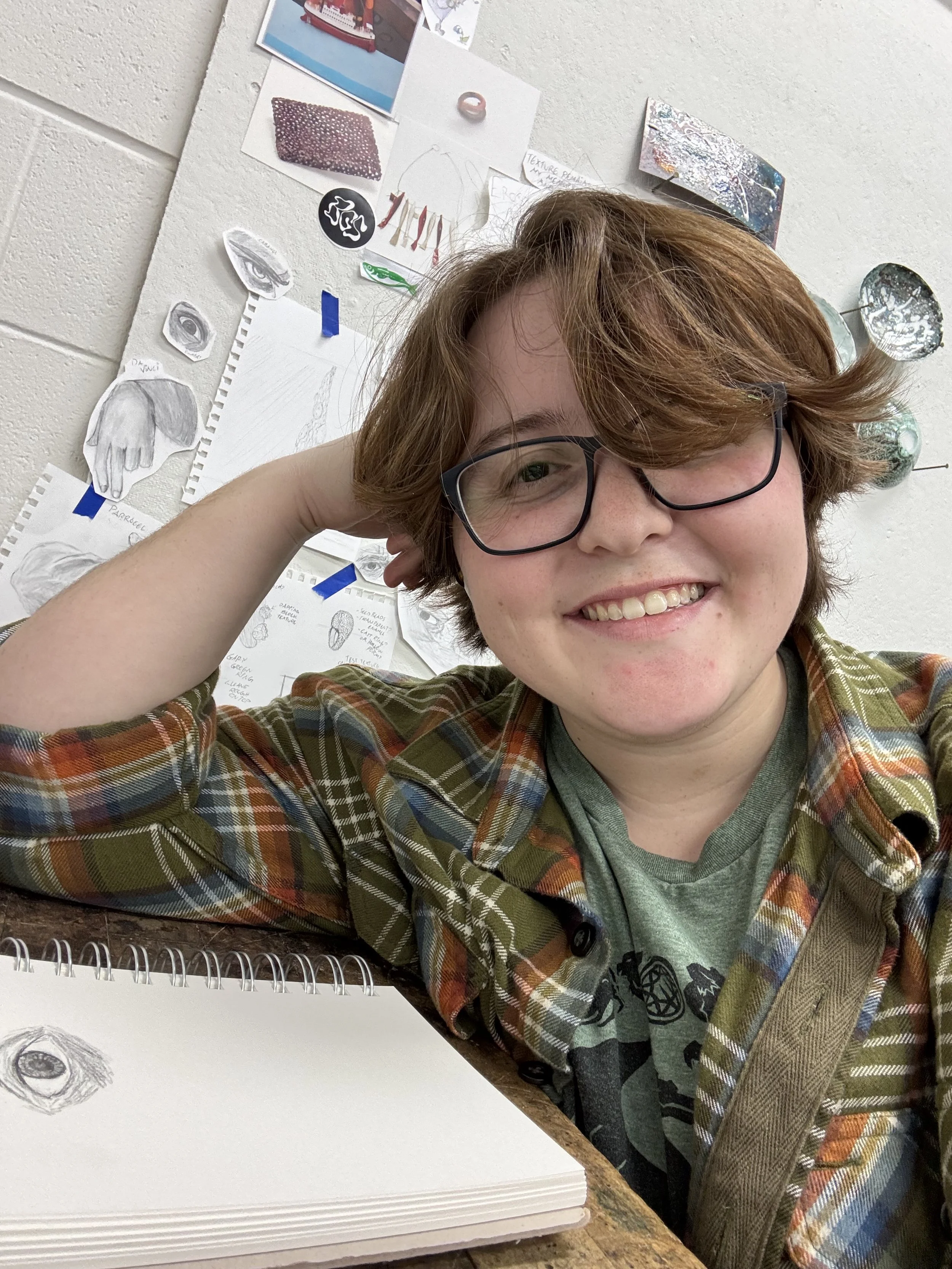Wren Flick is an emerging metals artist born and raised in Henderson, Nevada. He started out in his childhood working in his grandmother’s glass studio and painting with his father. He then became a French Horn player, and eventually landed on metalsmithing. Using metals, stones, found objects, and enamels, his work largely focuses on the ideas of human connection, vessels, and texture. Wren graduated in 2024 from Boise State University with a BFA in Visual Arts emphasizing Art Jewelry and Metalsmithing. Wren was featured in the R. Grey Gallery silent auctions in 2022 and 2023. He was also featured online in the Ten Moir Gallery and has had a piece of his work published in the Arts to Hearts Nature artist collective book. When not in his studio, Wren spends much of his time cooking or out on the water, fishing, kayaking, or rockhounding on the shore. He is currently continuing his studies at the Cranbrook Academy of Art.