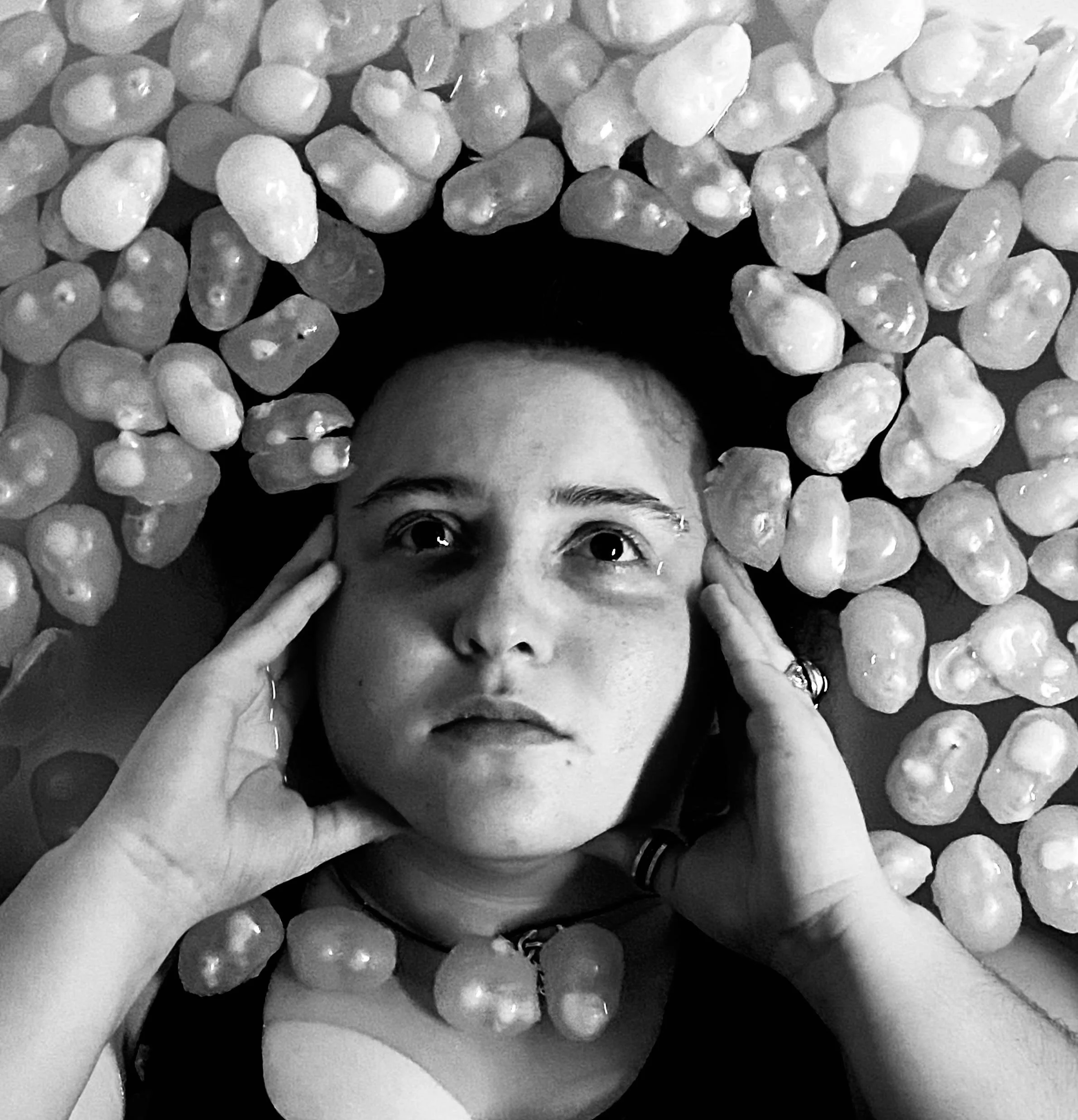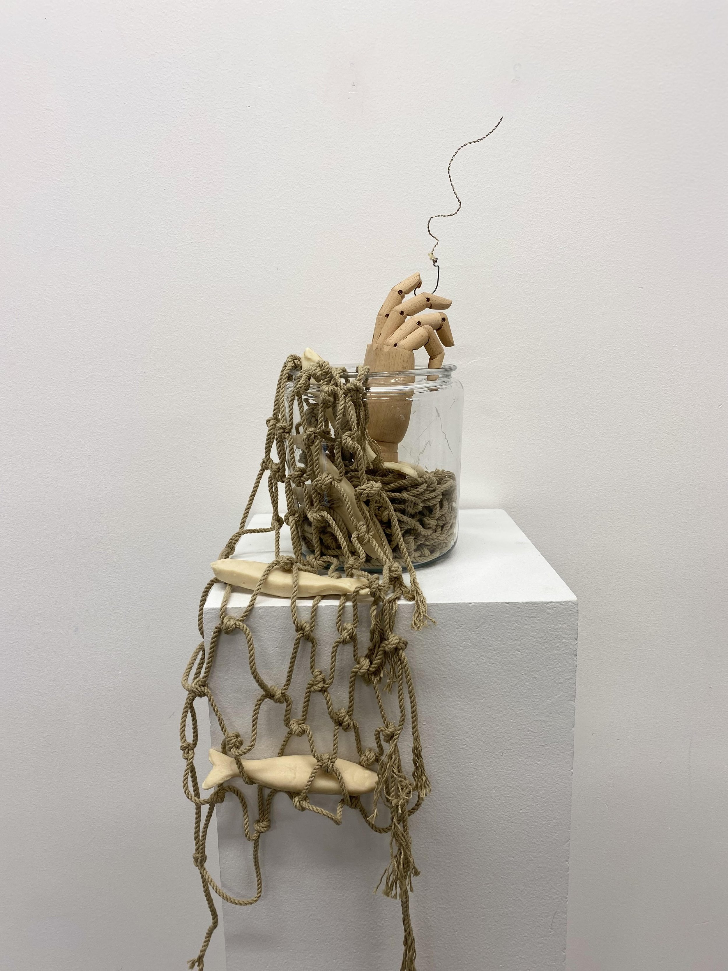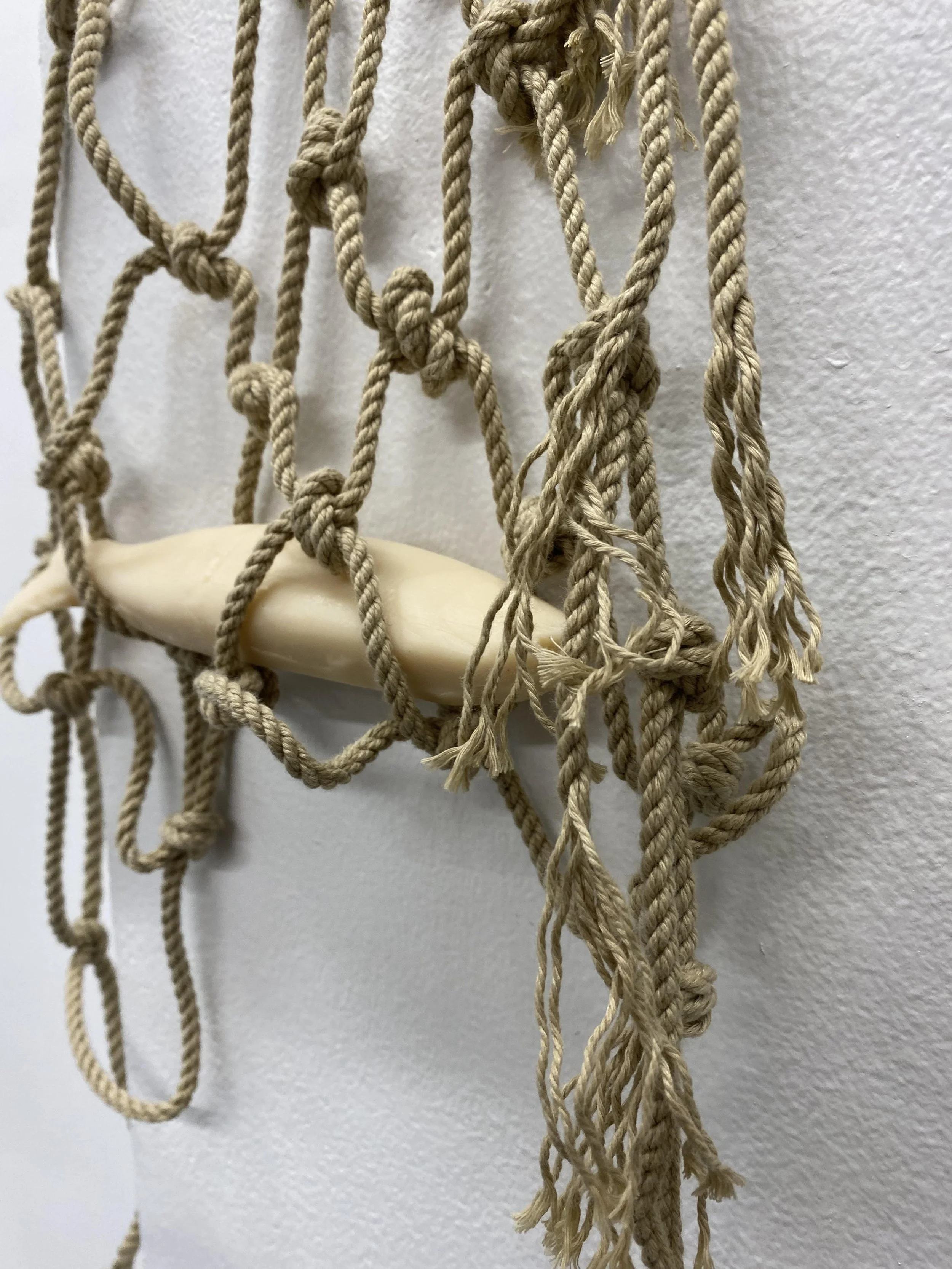 “Heavy Handed.” 2023, Beeswax, Mannequin Hand, Rope, Wire, Fishing Hook.