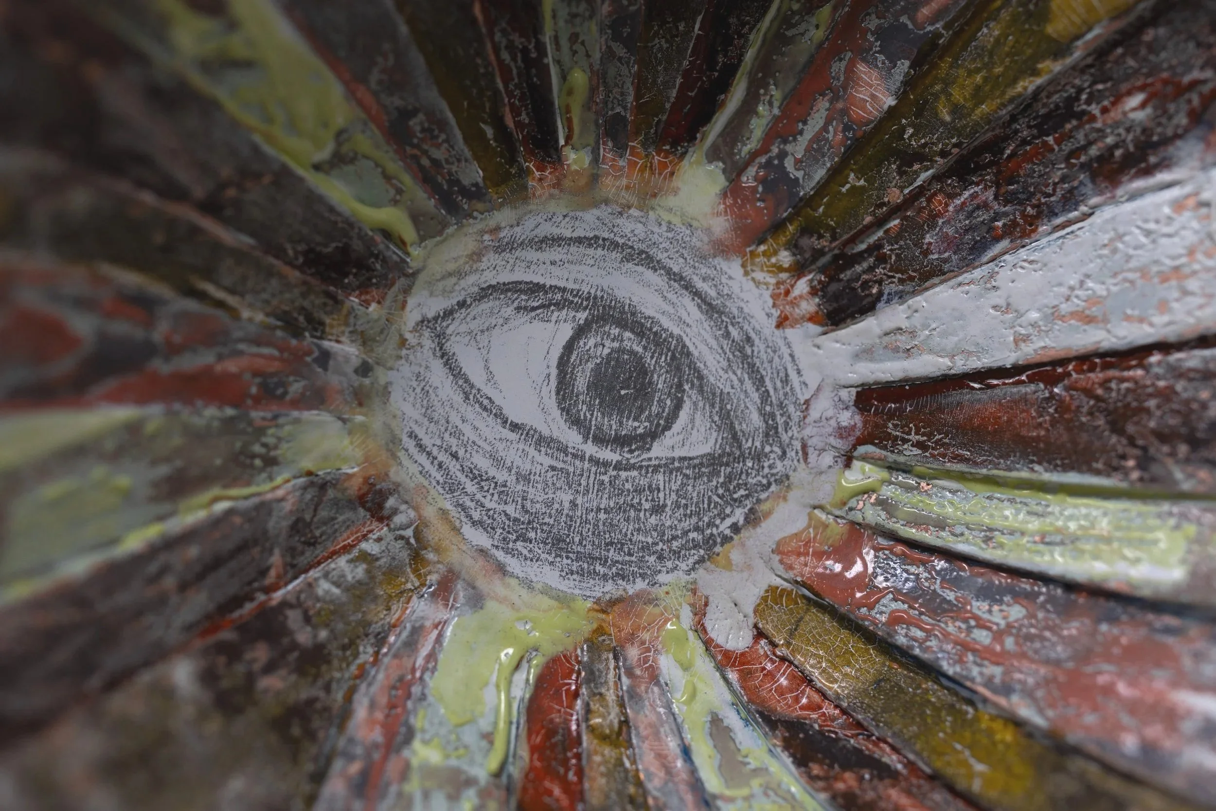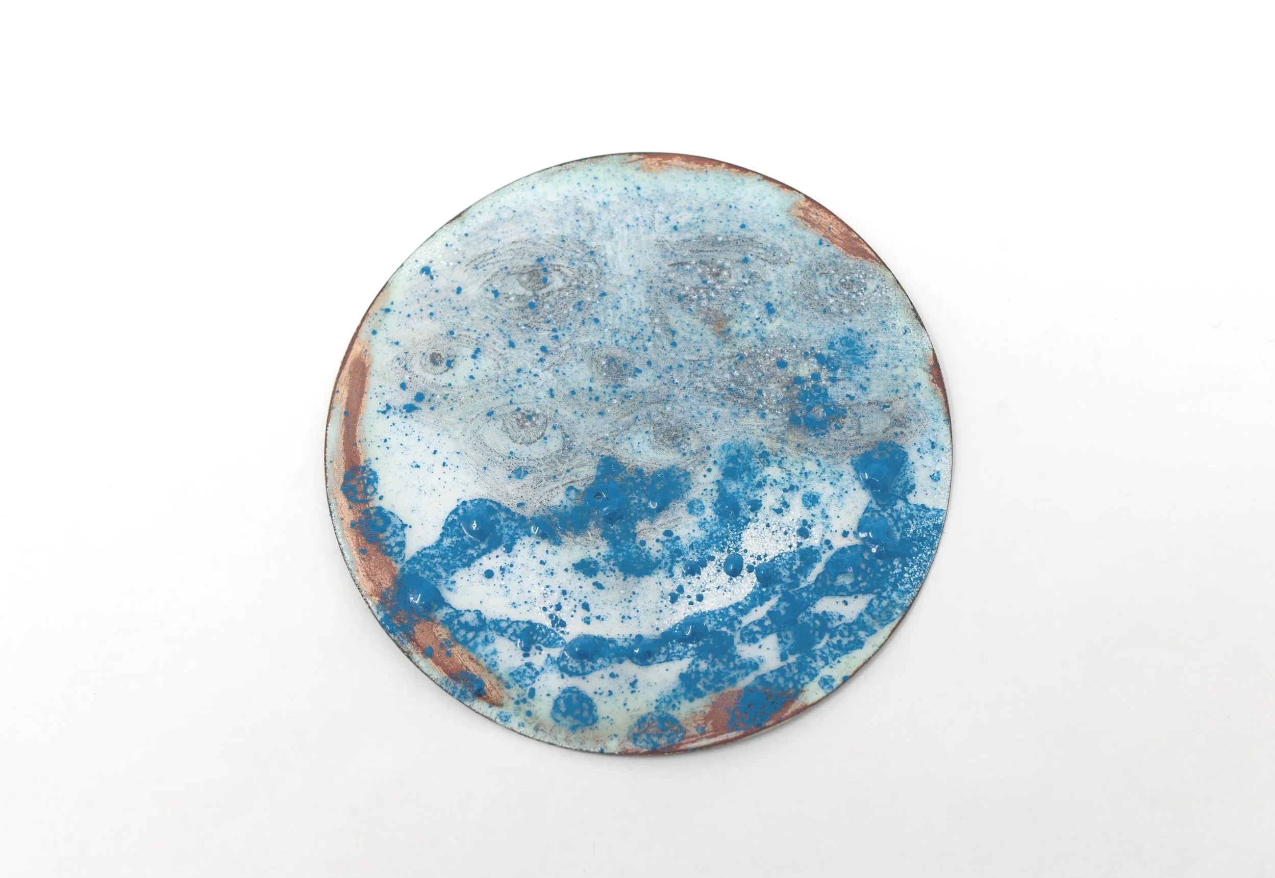 “Eye Plaque 2.” 2025, Copper, Enamel, Graphite