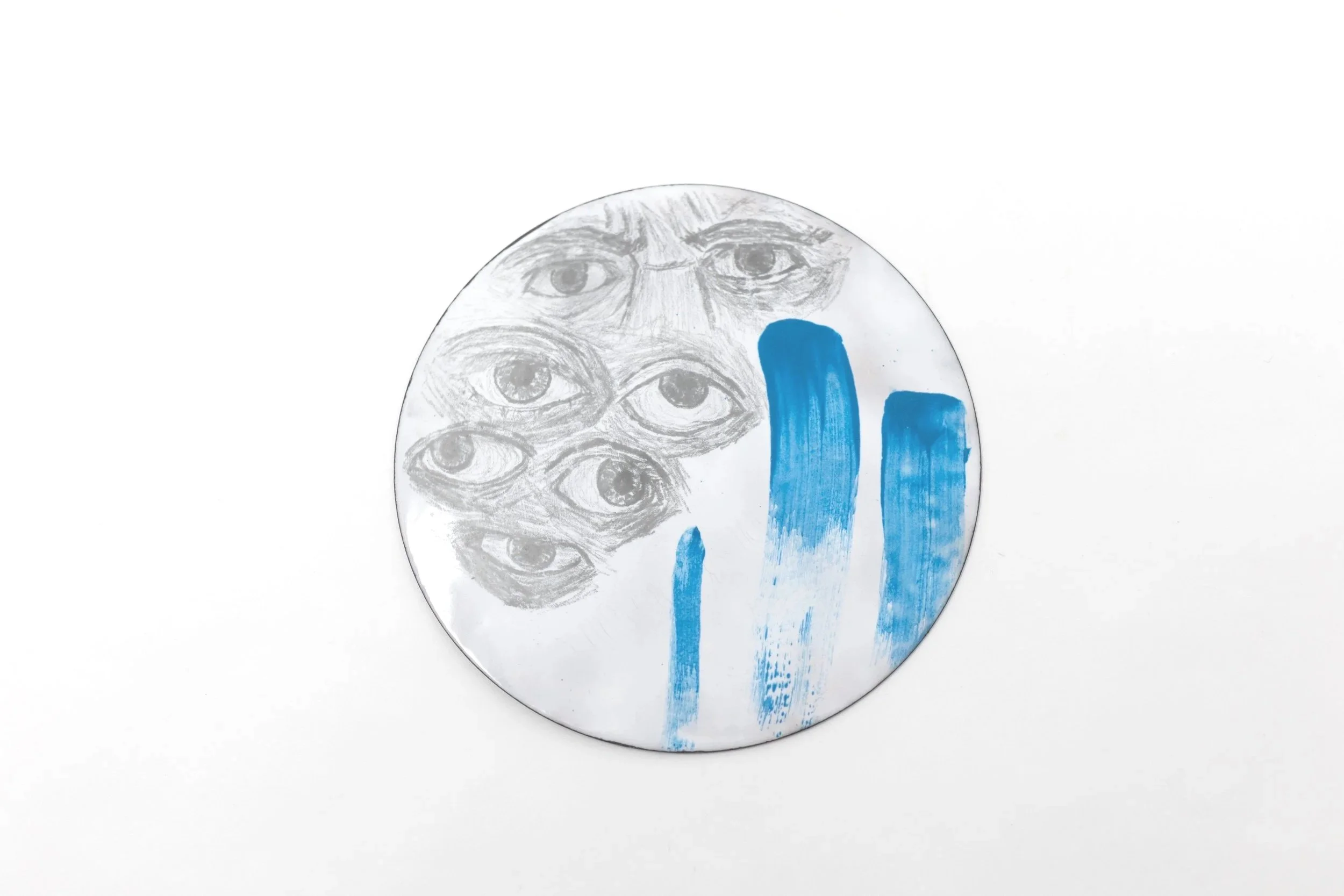 “Eye Plaque 1.” 2025, Copper, Enamel, Graphite